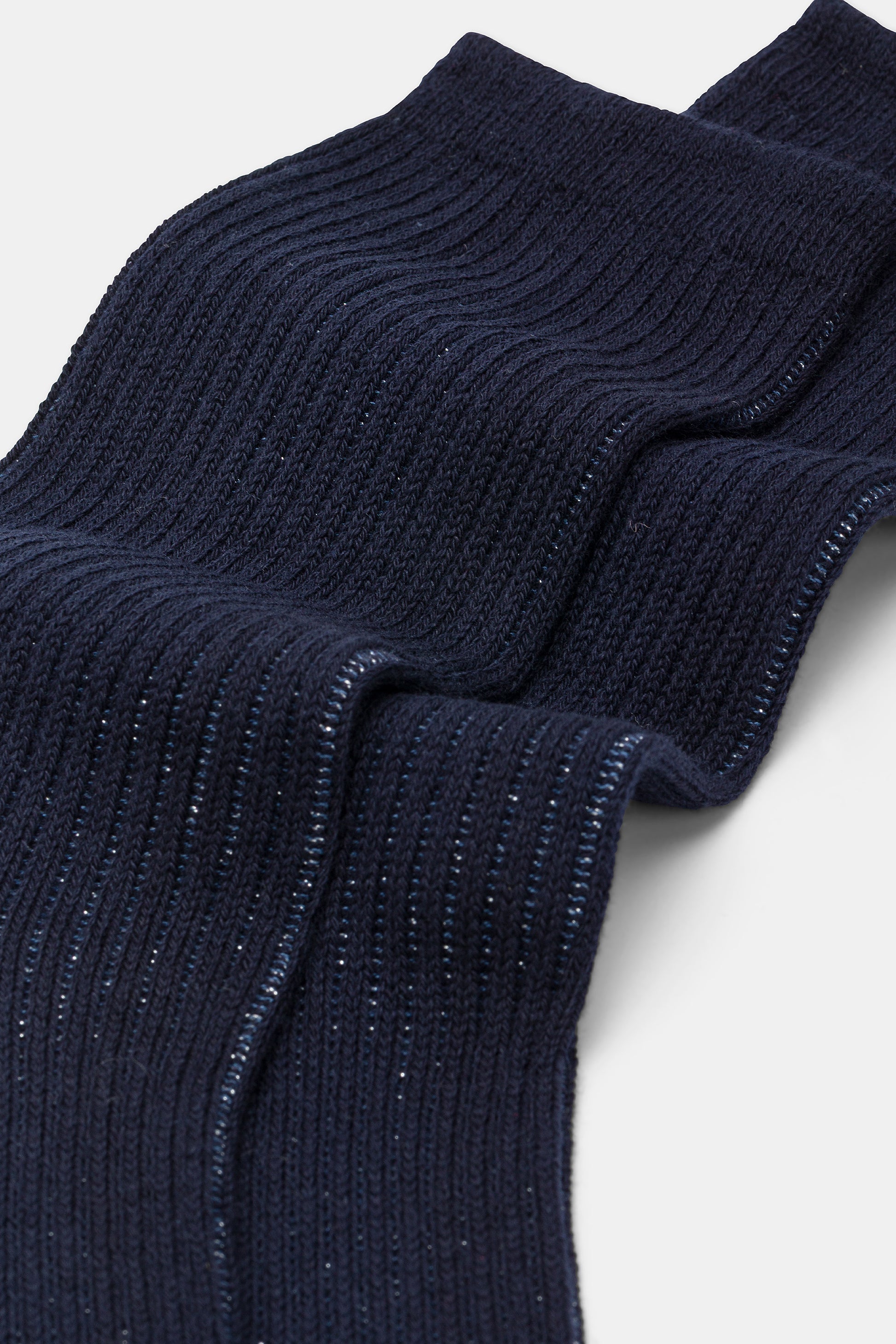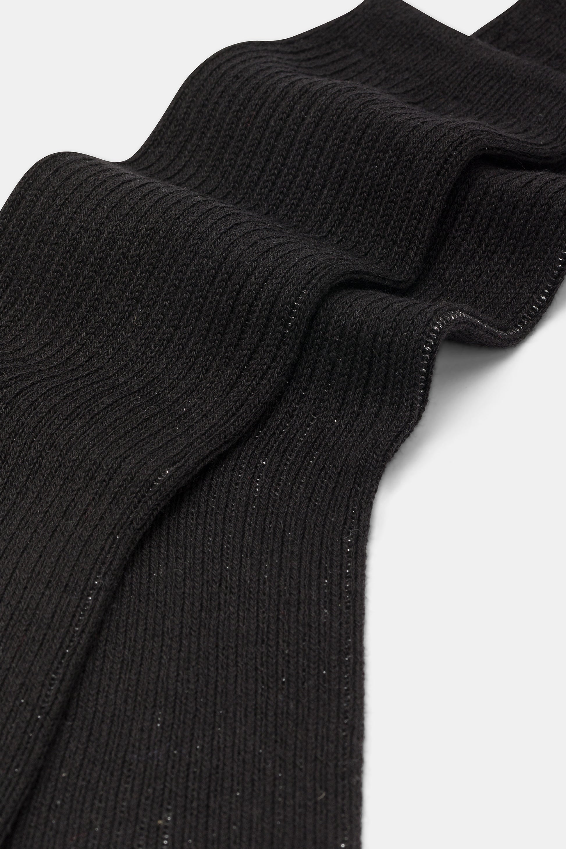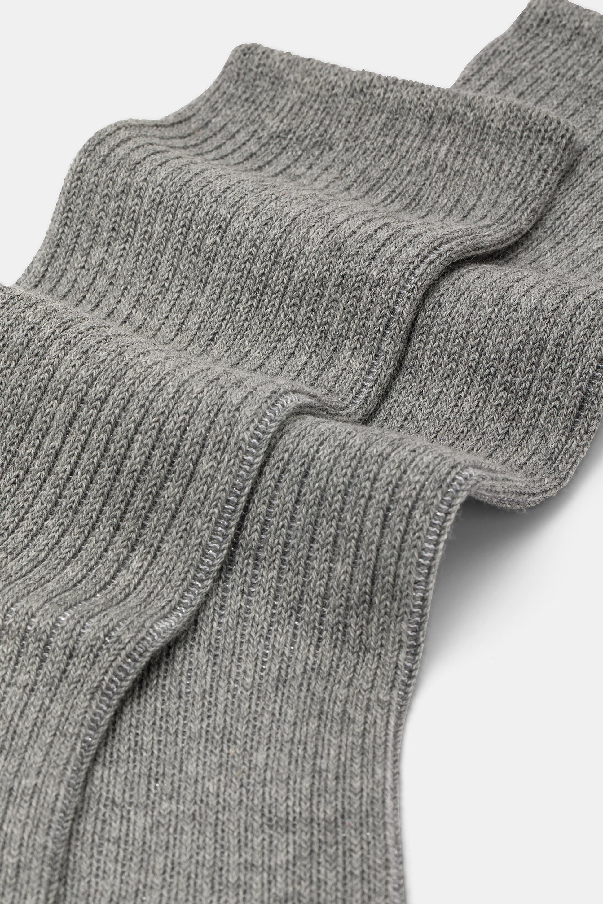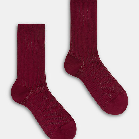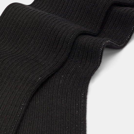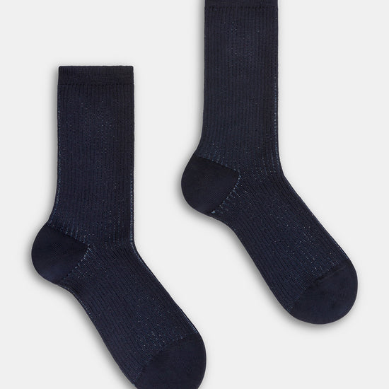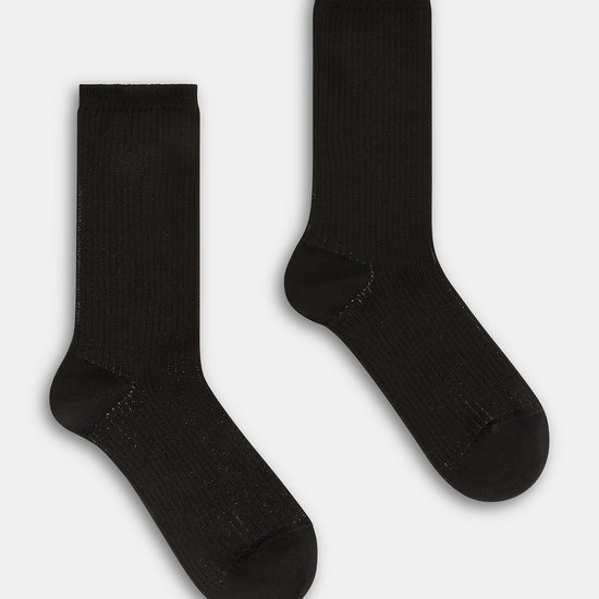 Calzino da donna realizzato con una raffinata lavorazione a costa 2:2 in caldo cotone e lurex.