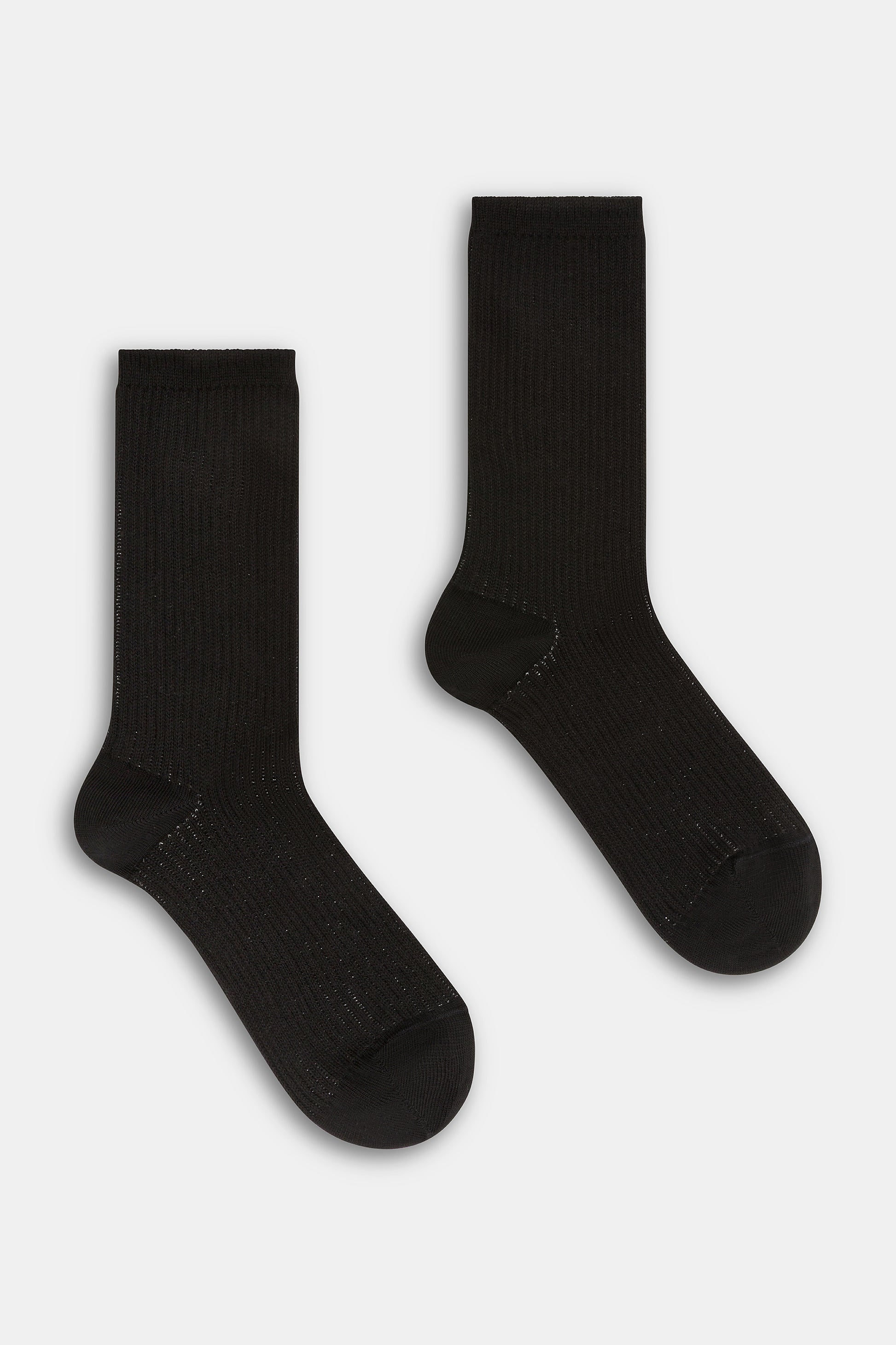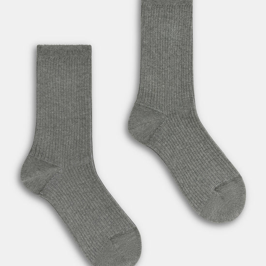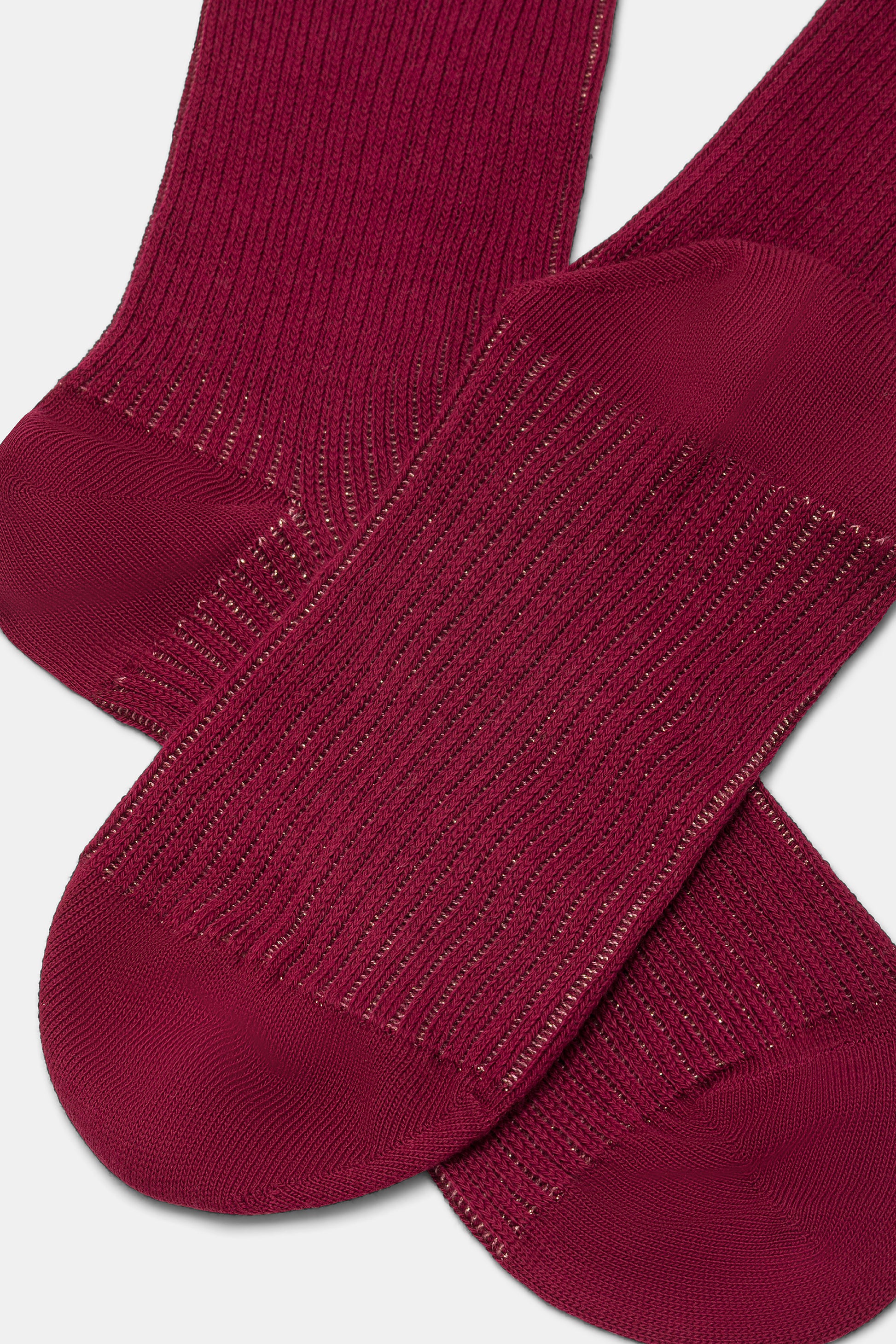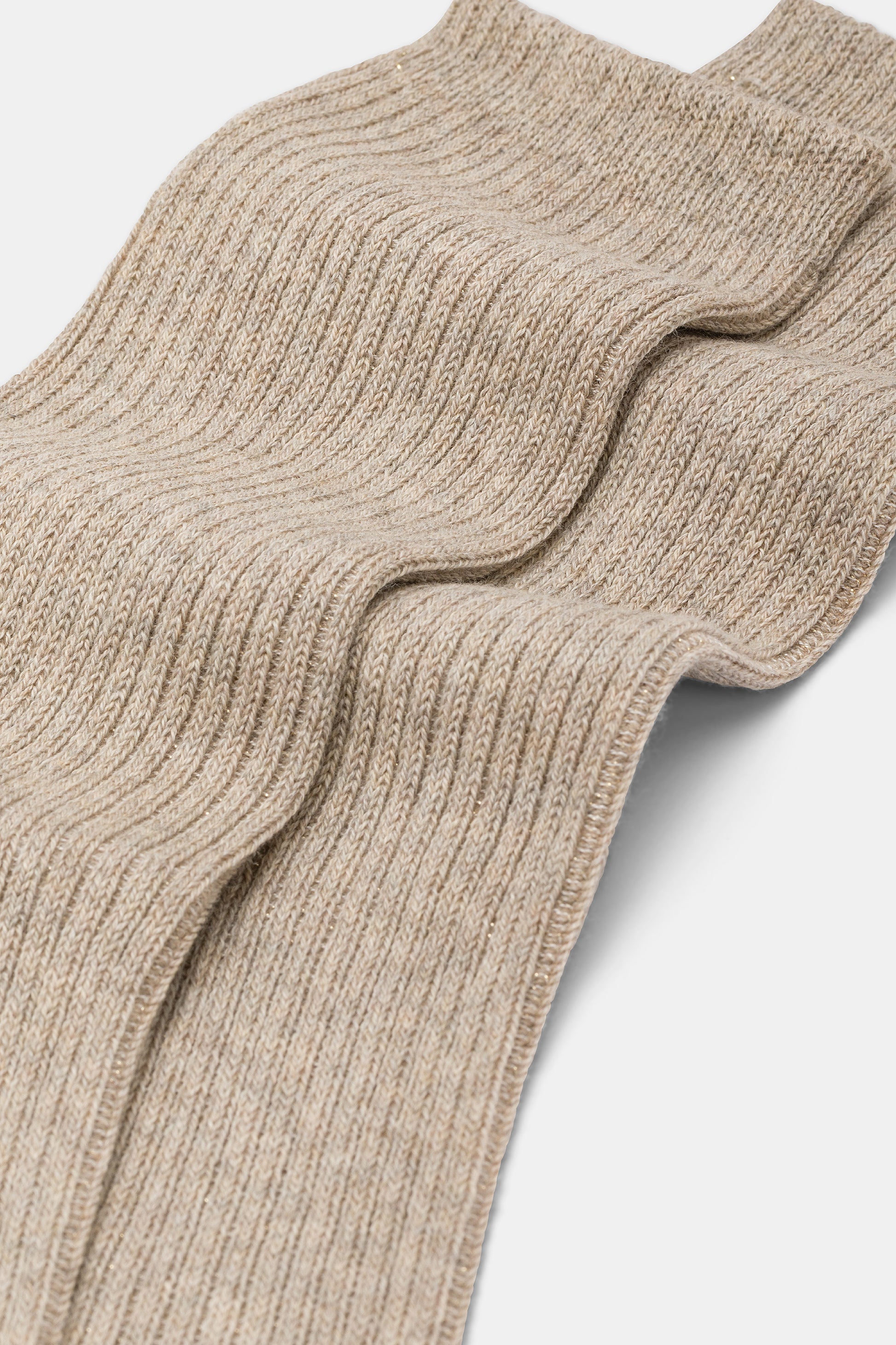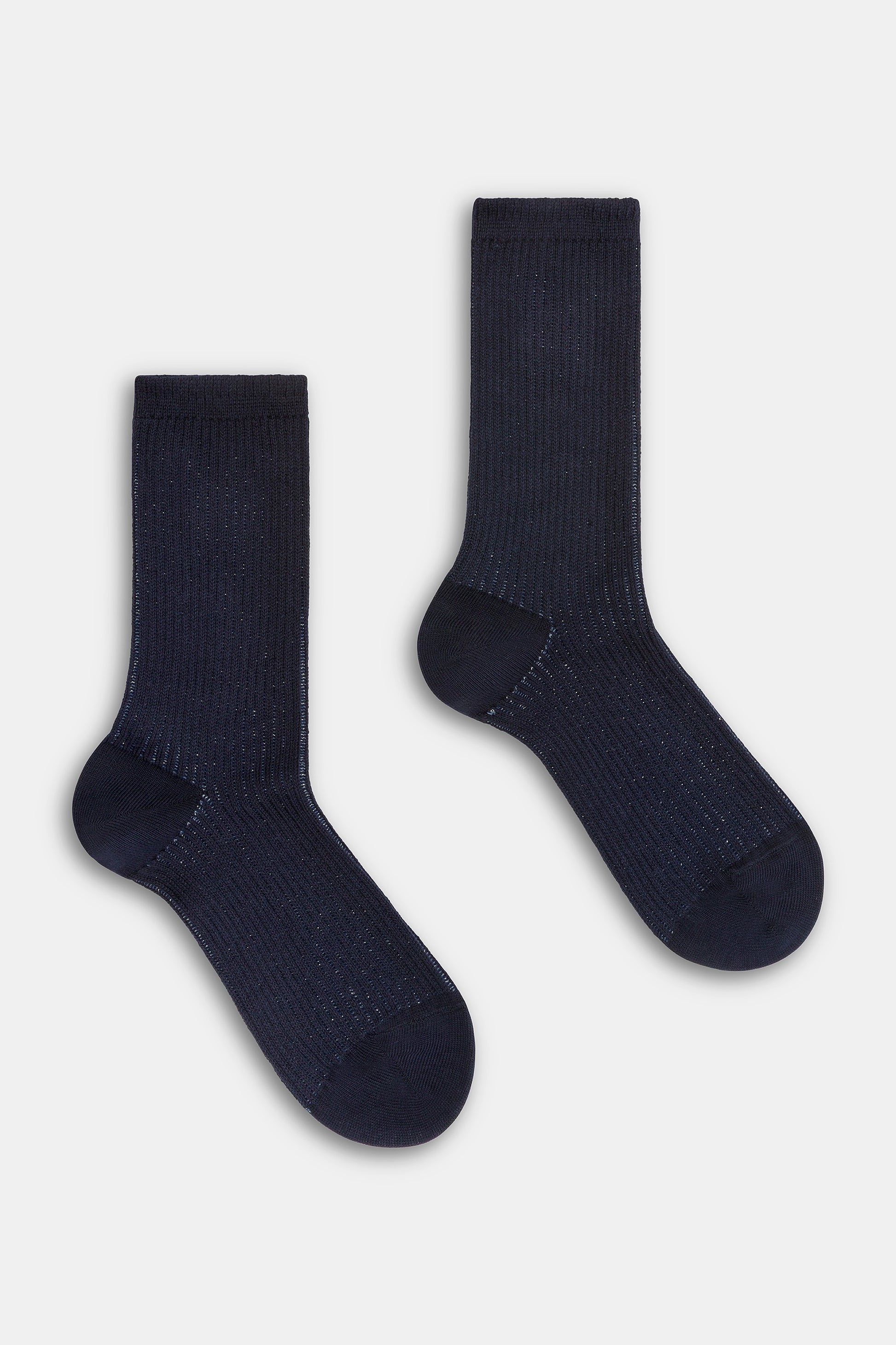 Calzino da donna realizzato con una raffinata lavorazione a costa 2:2 in caldo cotone e lurex.