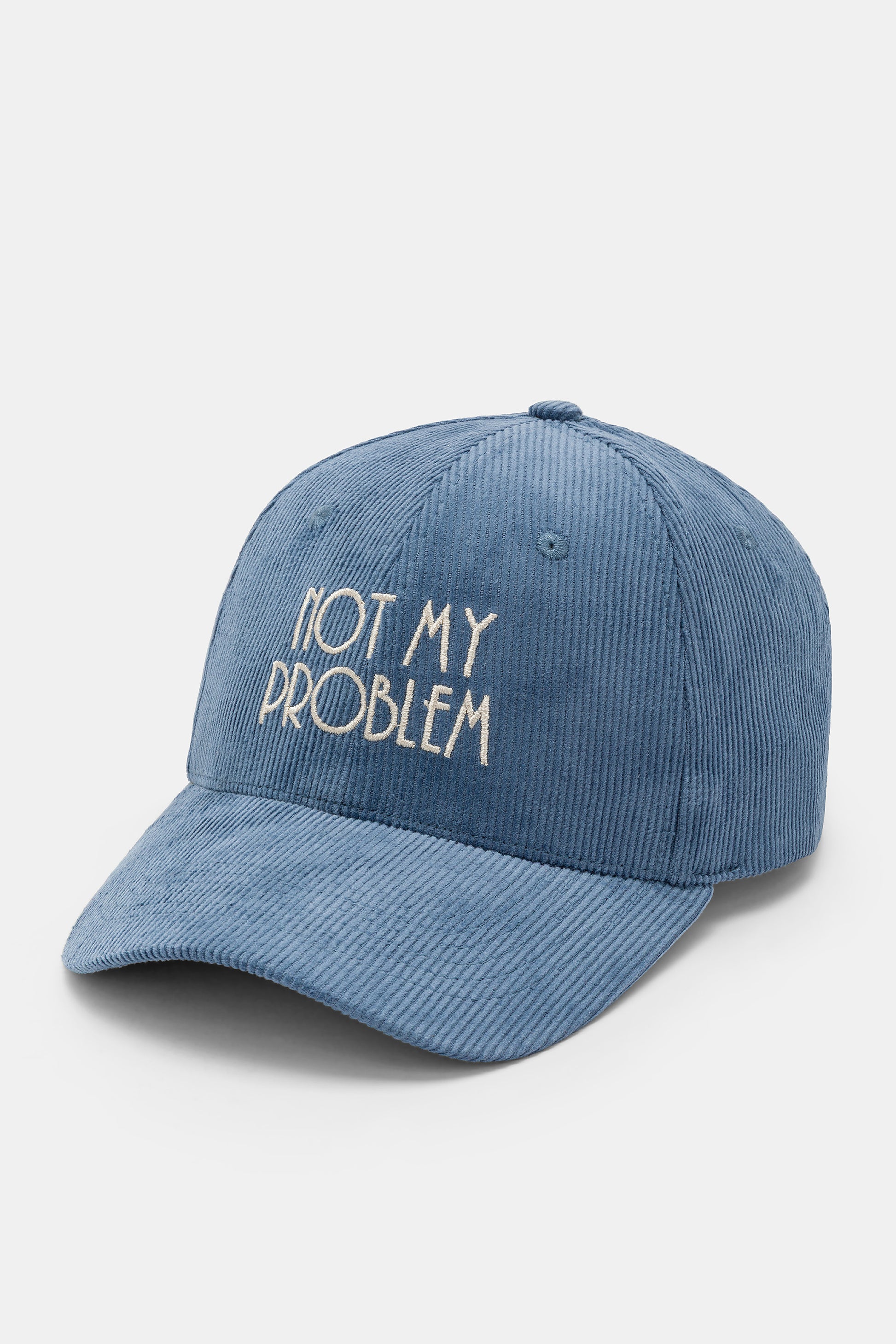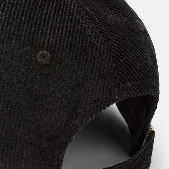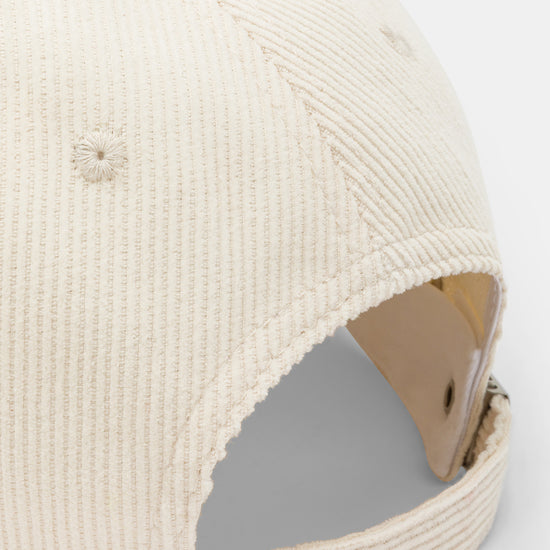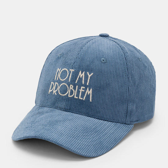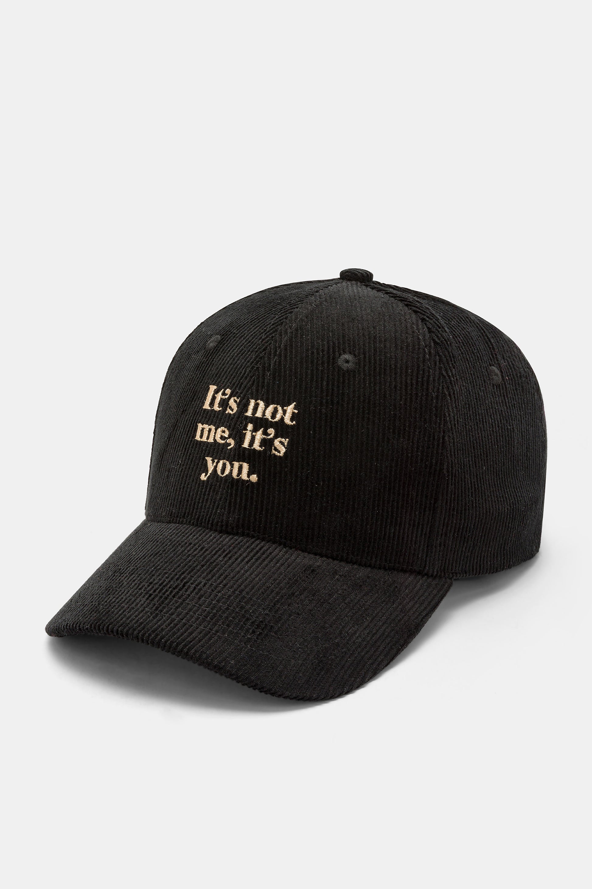 Cappello con visiera, realizzato in velluto a coste a tinta unita con scritte ricamate.