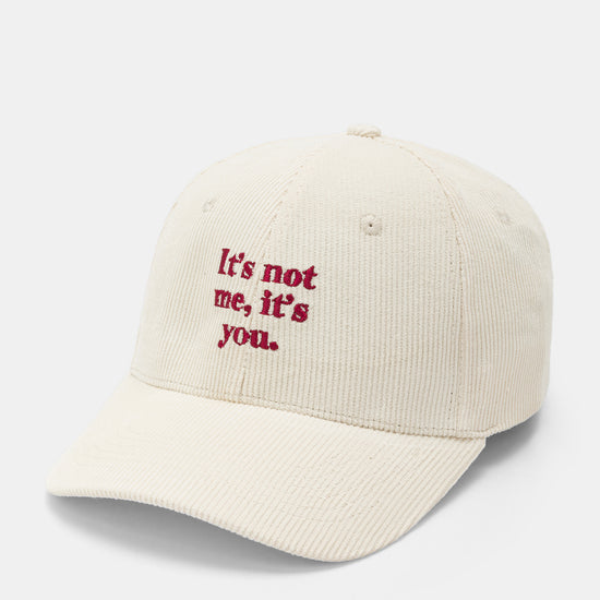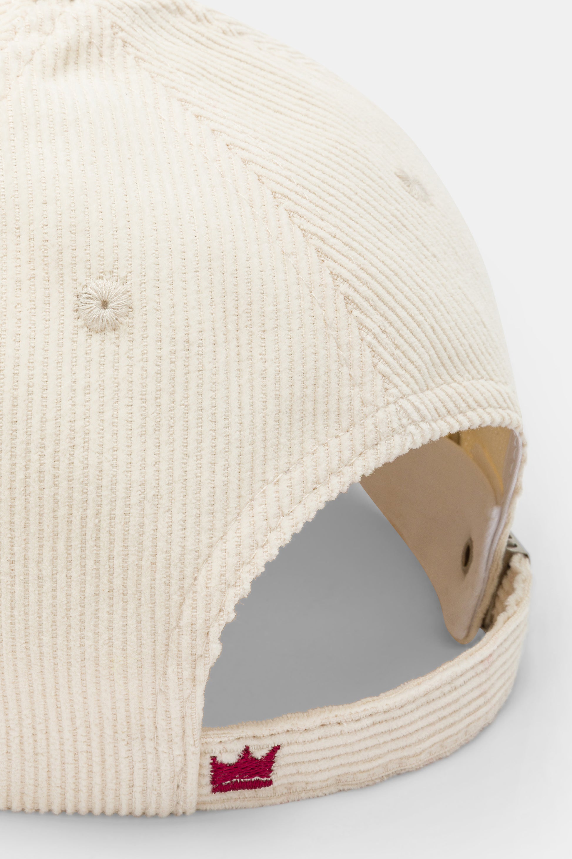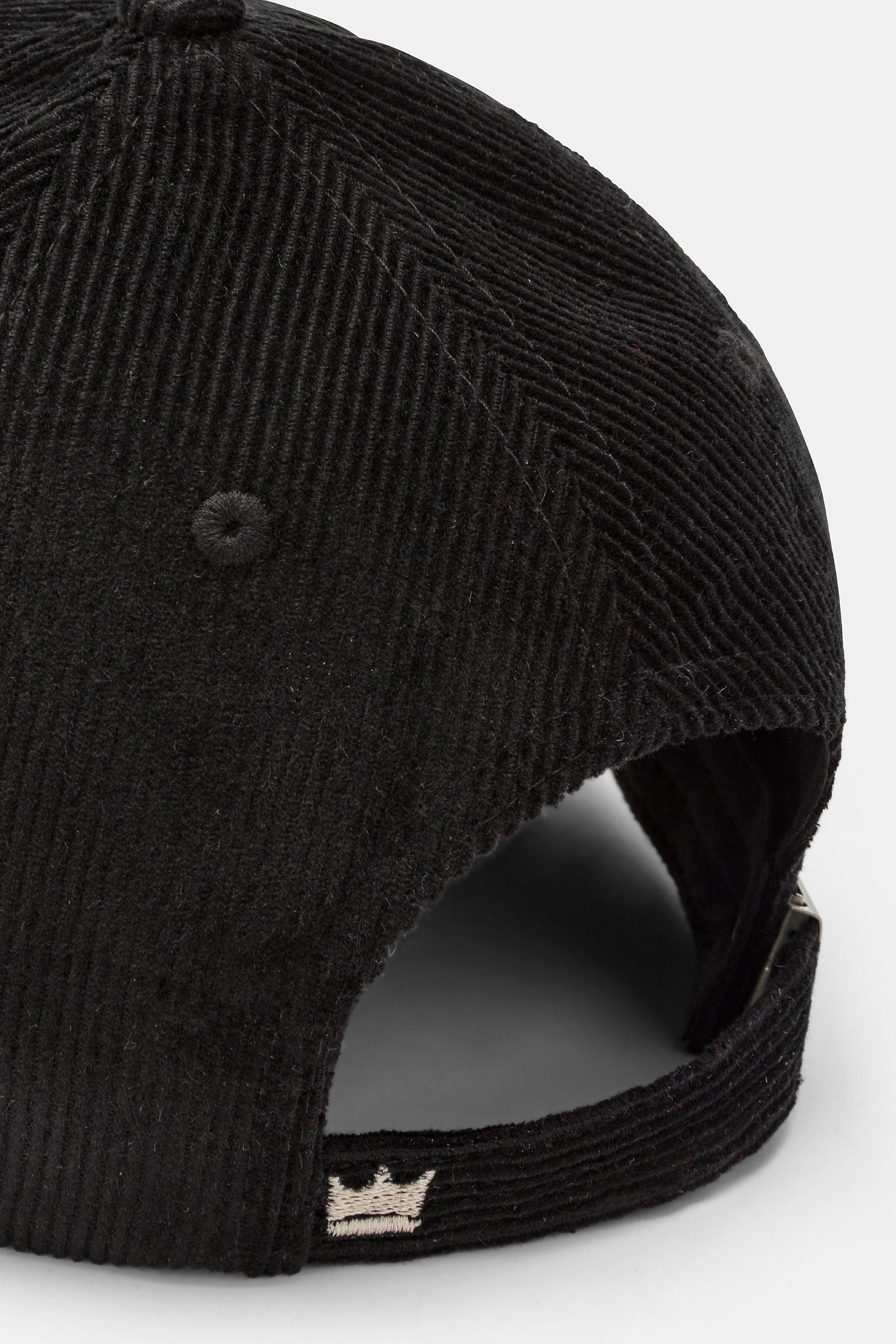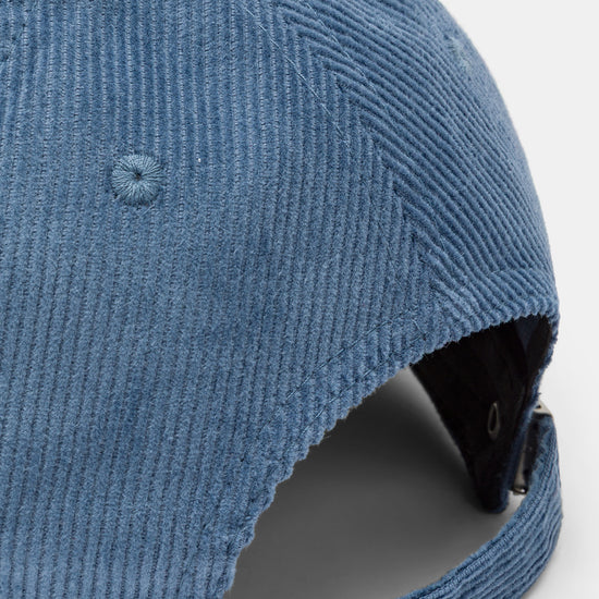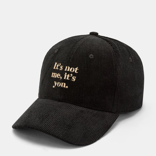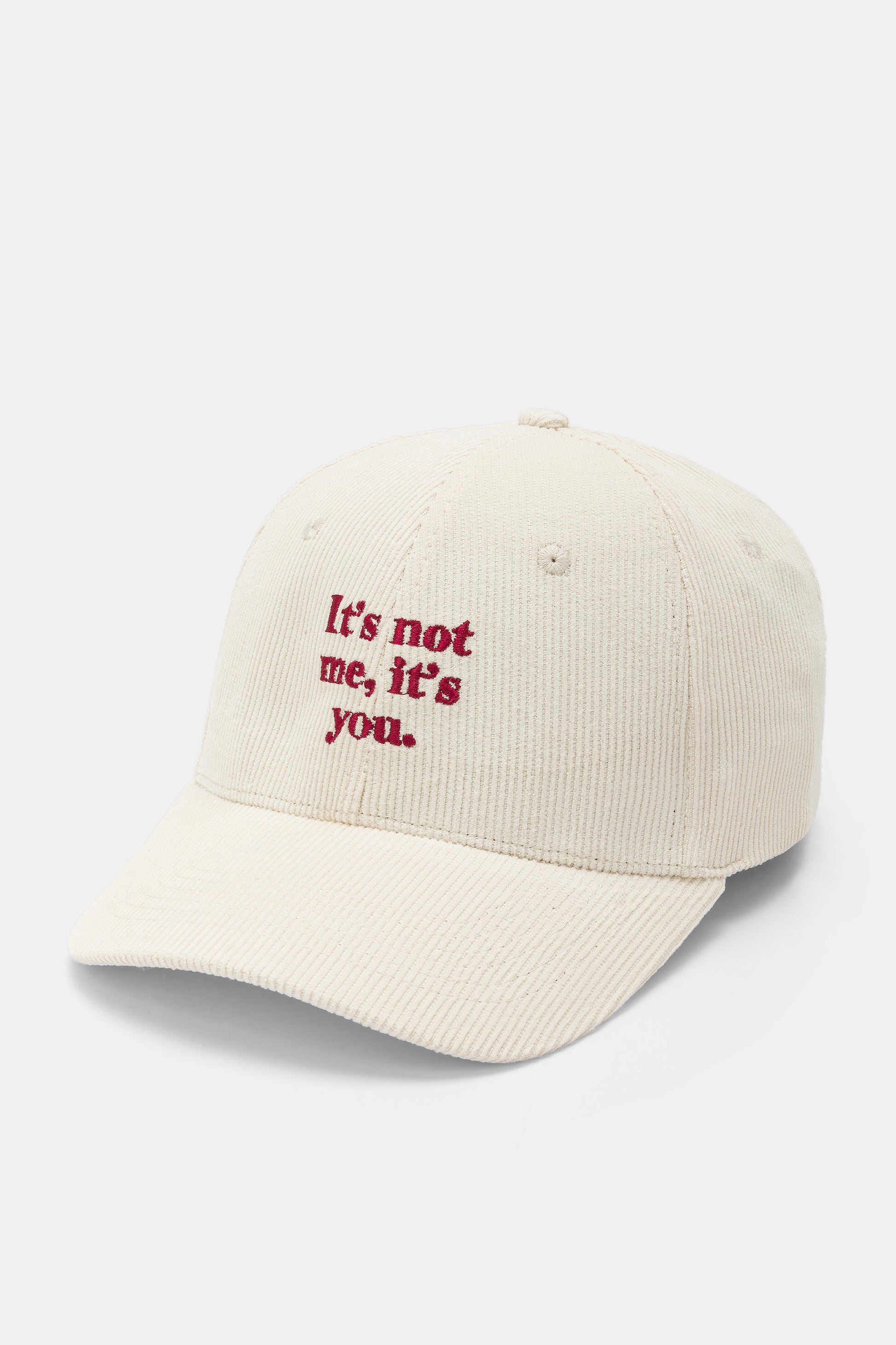 Cappello con visiera, realizzato in velluto a coste a tinta unita con scritte ricamate.