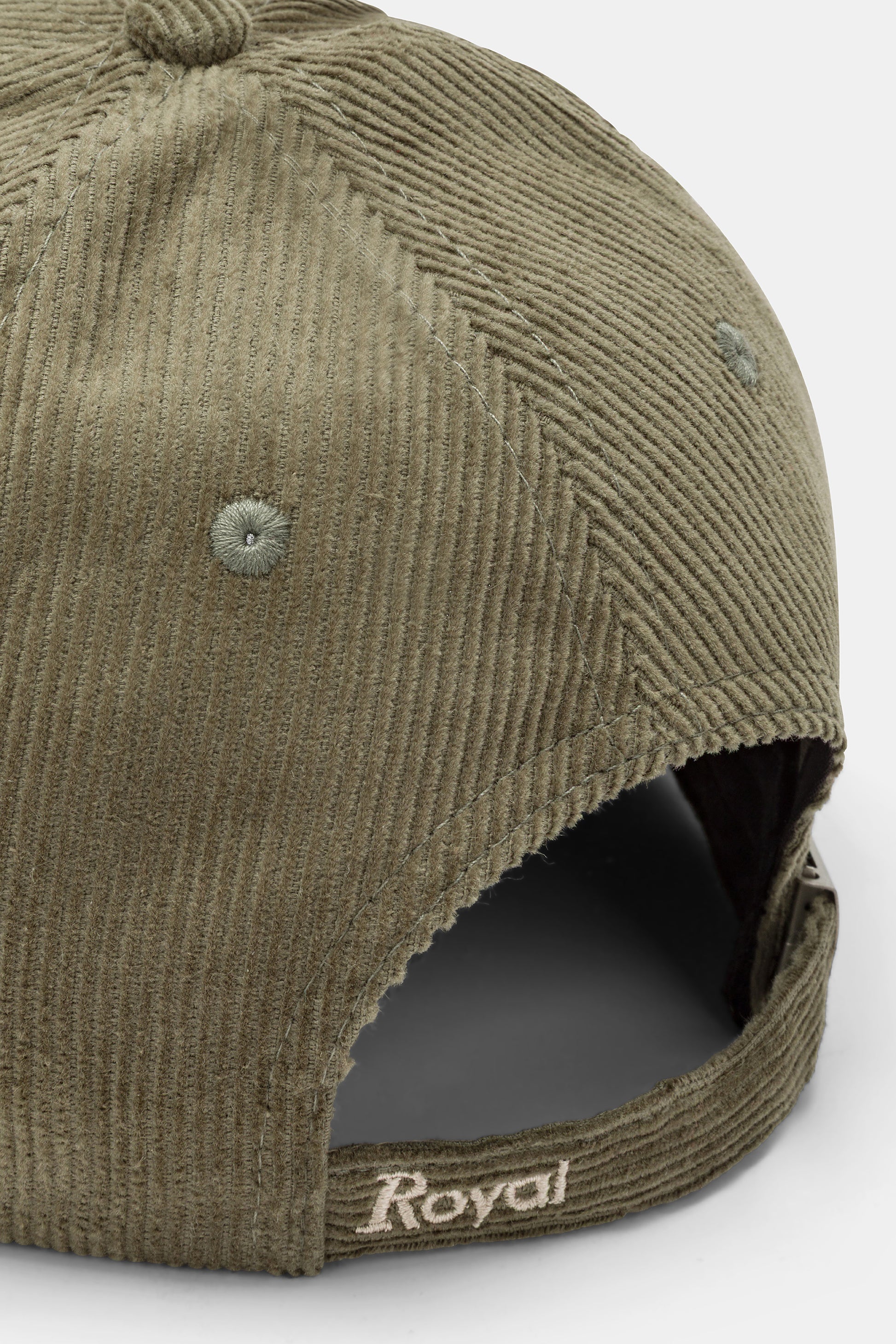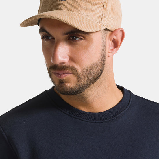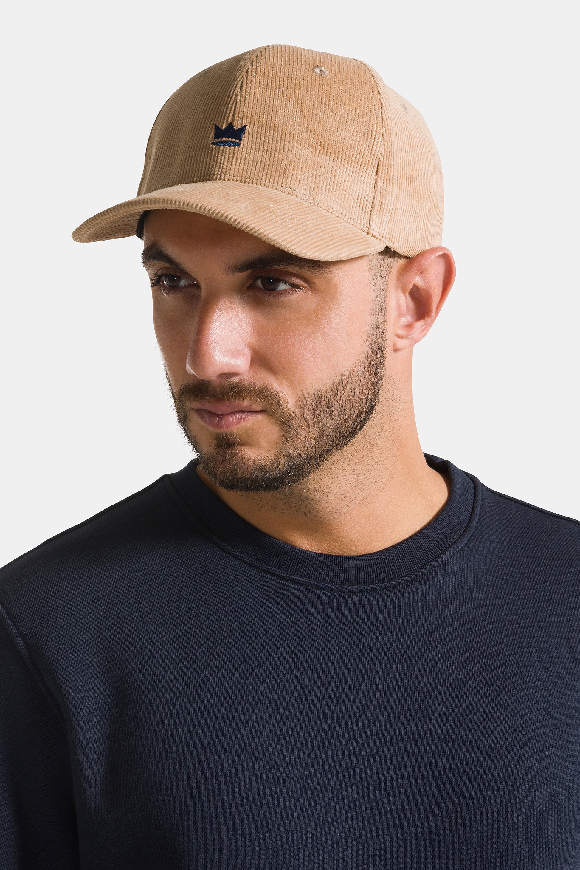 Cappello con visiera, realizzato in velluto a coste a tinta unita con corona ricamata.